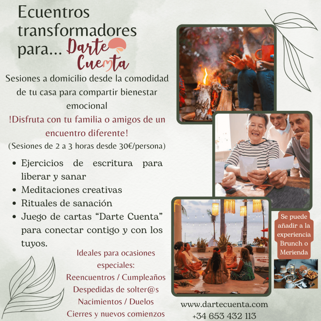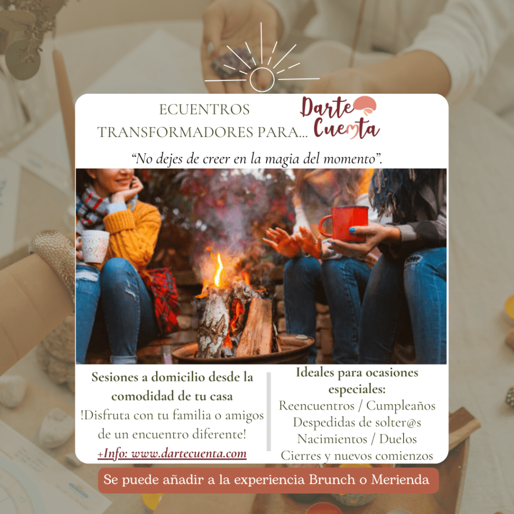 Cada encuentro holístico se convierte en un momento perfecto para abrir y fortalecer los vínculos afectivos y sanar nuestras relaciones. Cada sesión esta cargada de herramientas como la escritura terapéutica que nos permite liberar y sanar nuestras heridas, la meditación que es ese encuentro con nosotros mismos y con nuestro verdadero ser, la cuentoterapia o circulos de lecturas reflexivas porque nos permiten ampliar nuestra perspectiva y abrirnos a la aceptación de nuevas creencias, así como también es un espacio ideal para jugar de una manera diferente, gracias a las cartas «DARTE CUENTA» una dinámica en la que a través de preguntas profundas llegaremos a conocernos mejor y a conocer mejor a los que nos rodean.